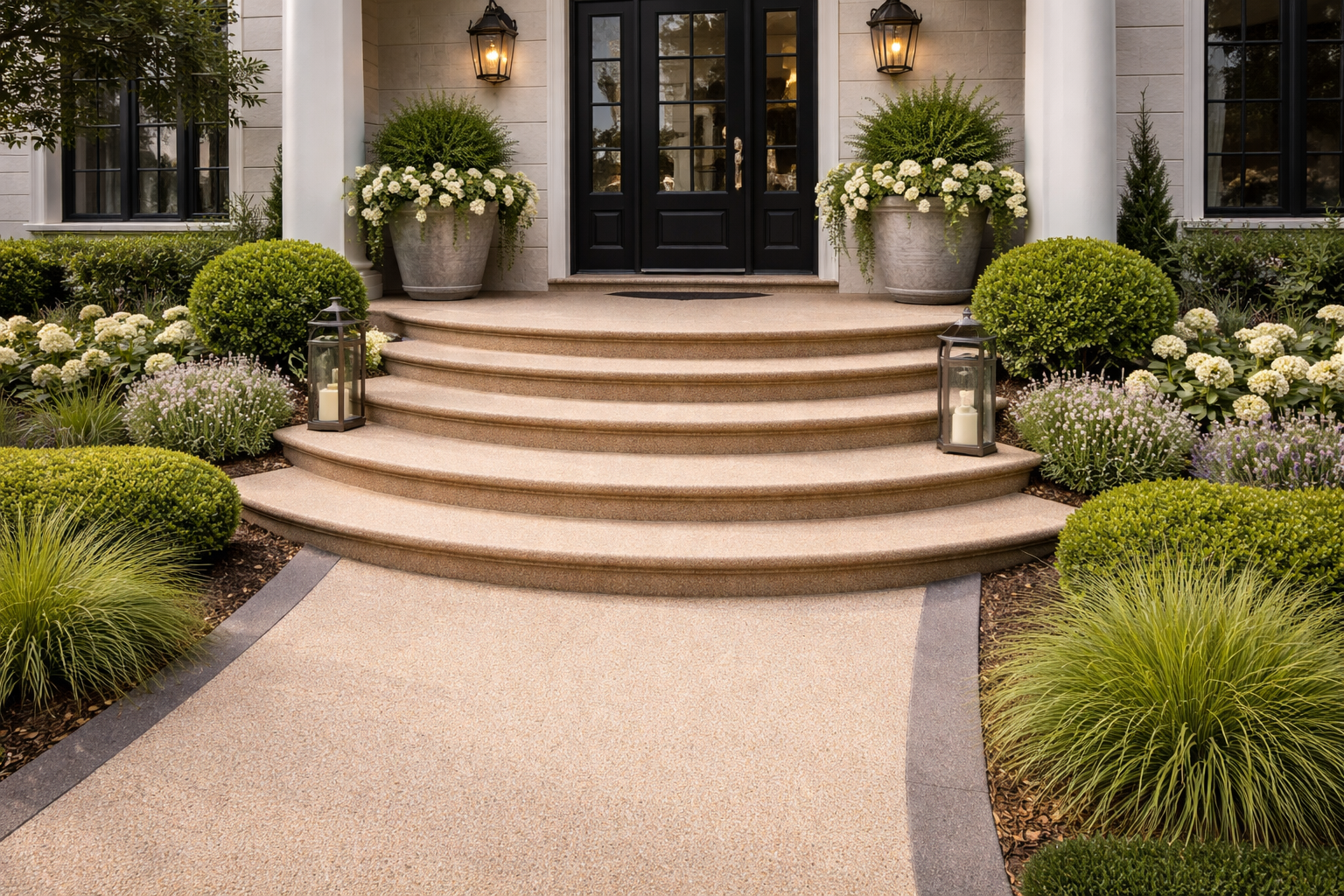 Resin-bound stone is a premium surfacing system made by mixing natural decorative aggregates with a UV-stable resin. The mixture is hand-troweled onto a prepared surface to create a smooth, seamless, and highly durable finish that is both visually appealing and slip-resistant.
